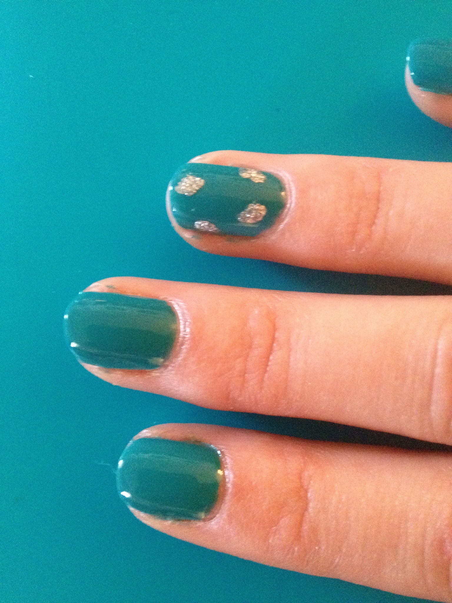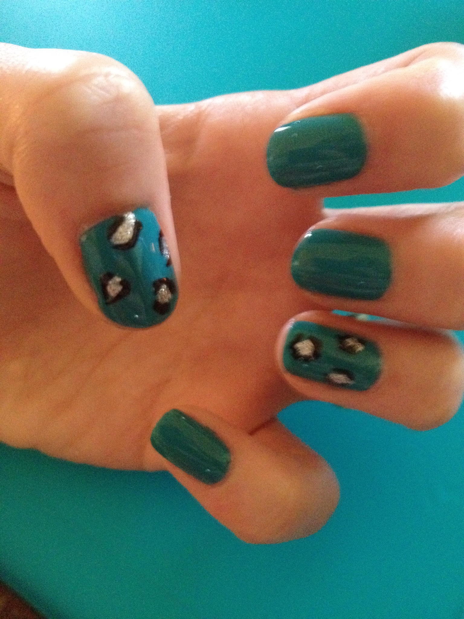 The first step is obviously to create your base. One clear coat (I used Sally Hansen’s Double Duty Base & Top Coat) followed by two coats of your favorite nail polish color. I used Nicki Minaj for OPI’s Fly. It’s a creamy teal color. I like it for this look because it glams up your animal print. You can always swap out colors and use a brown or a beige if you’d like it to look more like an actual leopard, but if you haven’t noticed, I’m a sucker for bright colors (especially the Nicki Minaj OPI collection). One of the best things about this look, though, is that it’s totally up to you which direction you’d like to go in.