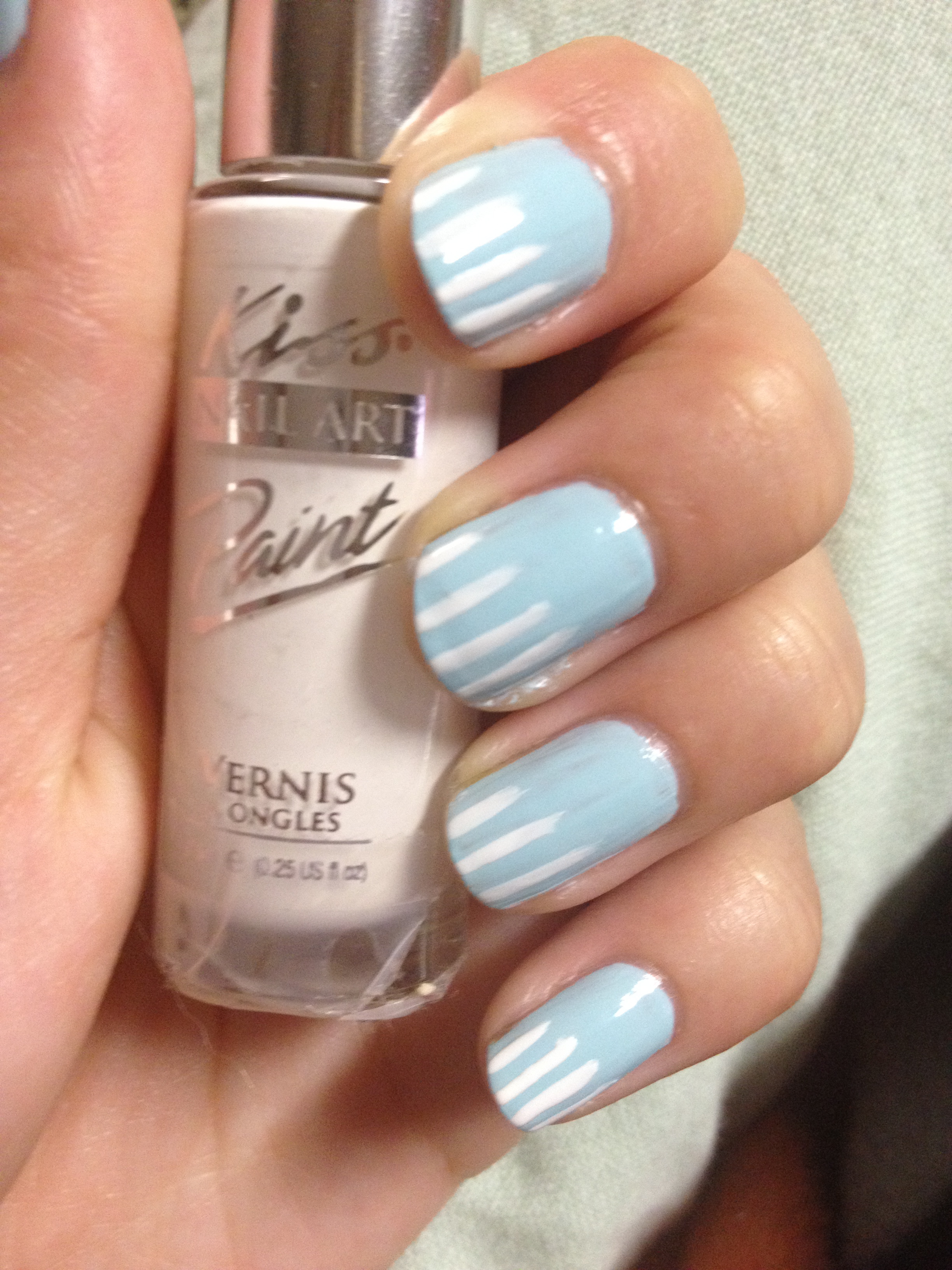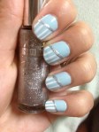 To create the white stripes, I used Kiss’s Nail Art Paint in White and created several vertical stripes down my nail. I wanted the design to go on a diagonal, so I made the lines slightly longer as I went across my nail, as shown in the photo to the right.