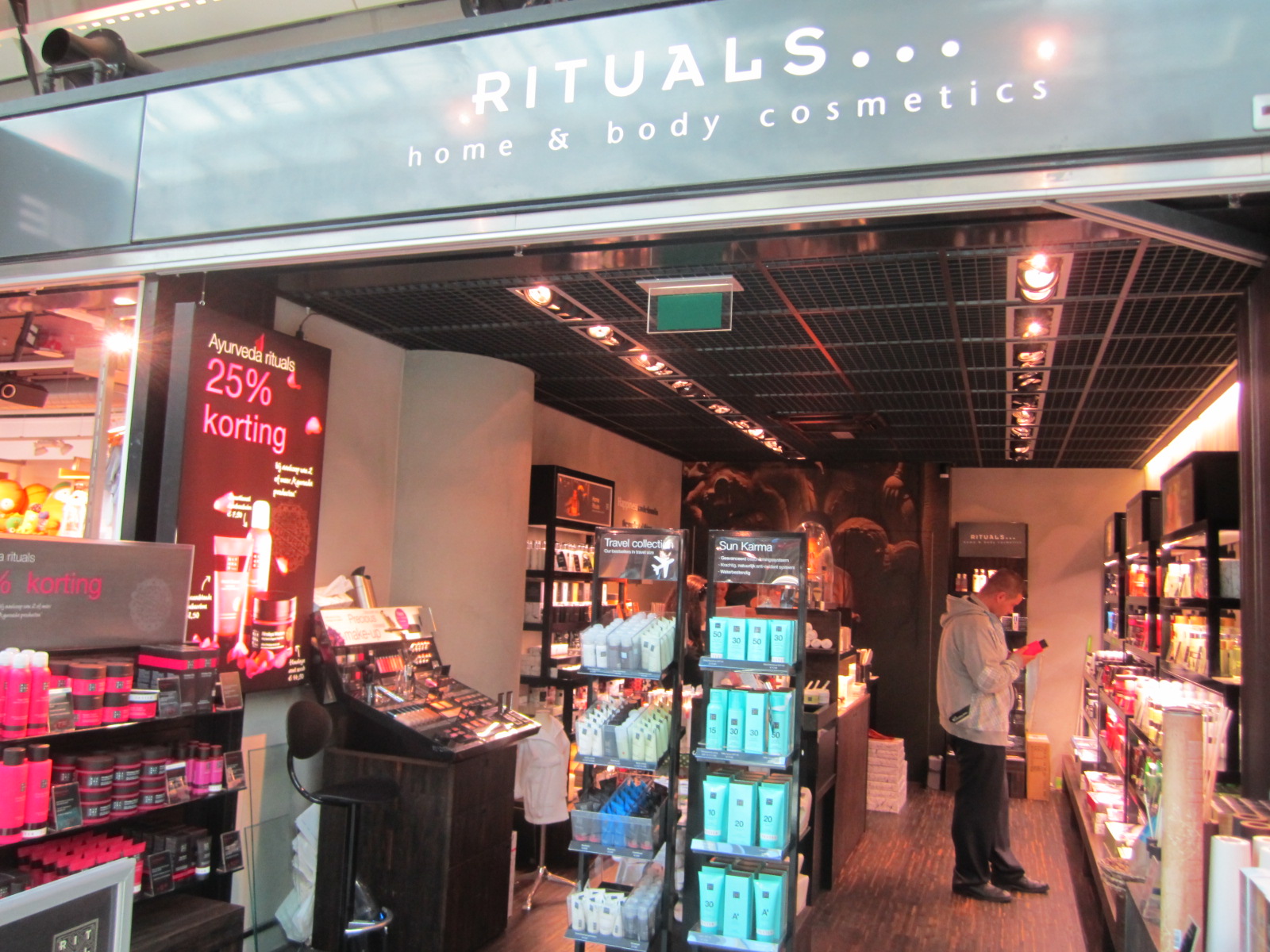 This is the Rituals boutique in the actual Amsterdam airport. Have you ever seen such a lovely, fully set up spa in the arrivals hall of another airport? I know I haven’t! This was my first intro into actually trying out their shower gels, and it instantly converted me to a brand fanatic. This store had a great cosmetics setup as well (center left), so it was fun to try out the colors.