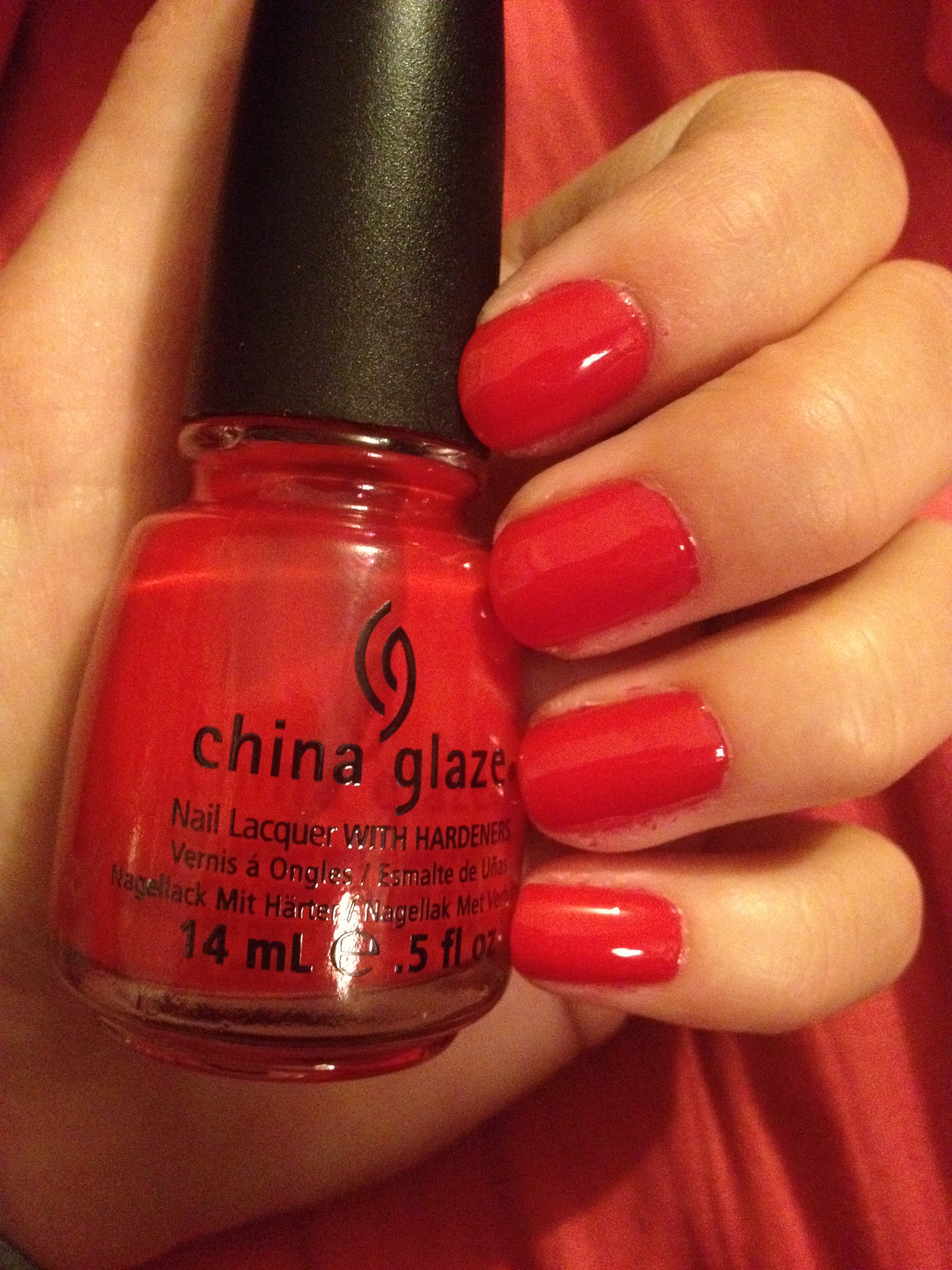 I needed time to think, so I started off with a regular manicure. After my base coat of Seche Natural, I applied two coats of China Glaze‘s Poinsettia. It’s the perfect true-red color. Then I continued to think.