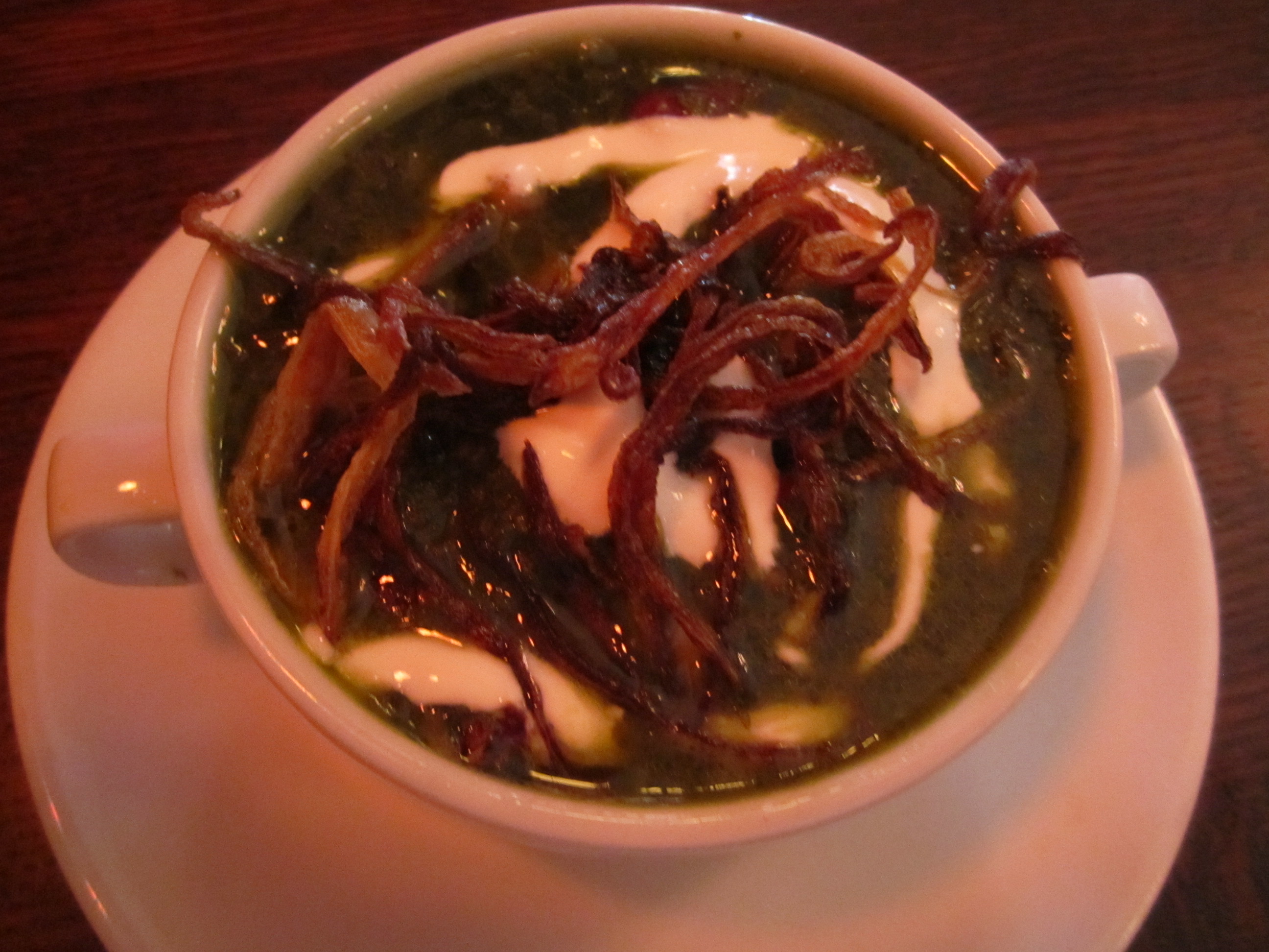 My mom decided to try Ash-e-reshteh, as the menu called it a “Persian favorite.” This soup was a sort of stew containing everything but the kitchen sink: noodles, lentils, scallions, herbs, and topped with homemade yogurt, friend mint, and crispy fried onions. The mint and scallions stood out the most. It had an unusual taste, but it was a cool treat to try.