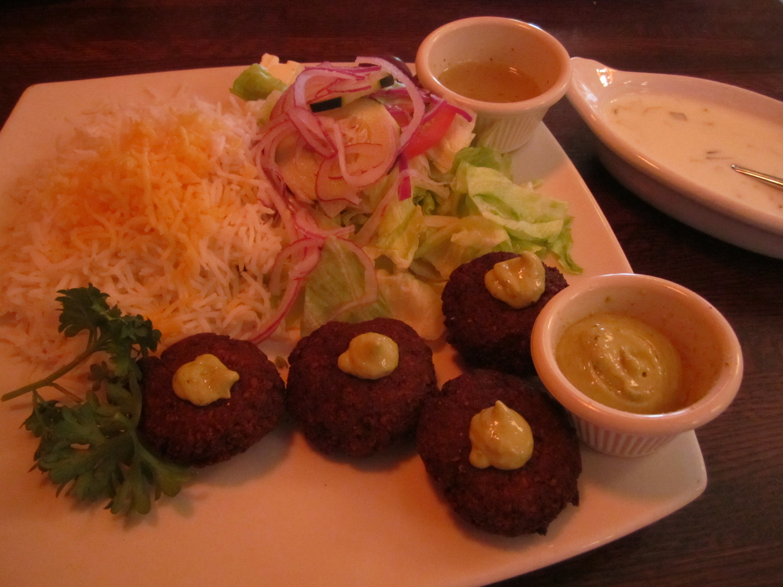 The sambosas are delicious, and I ca never pass them up on a trip to Narenj. Fried crisps stuffed with potatoes, onions, green beans, and spices are delicious!