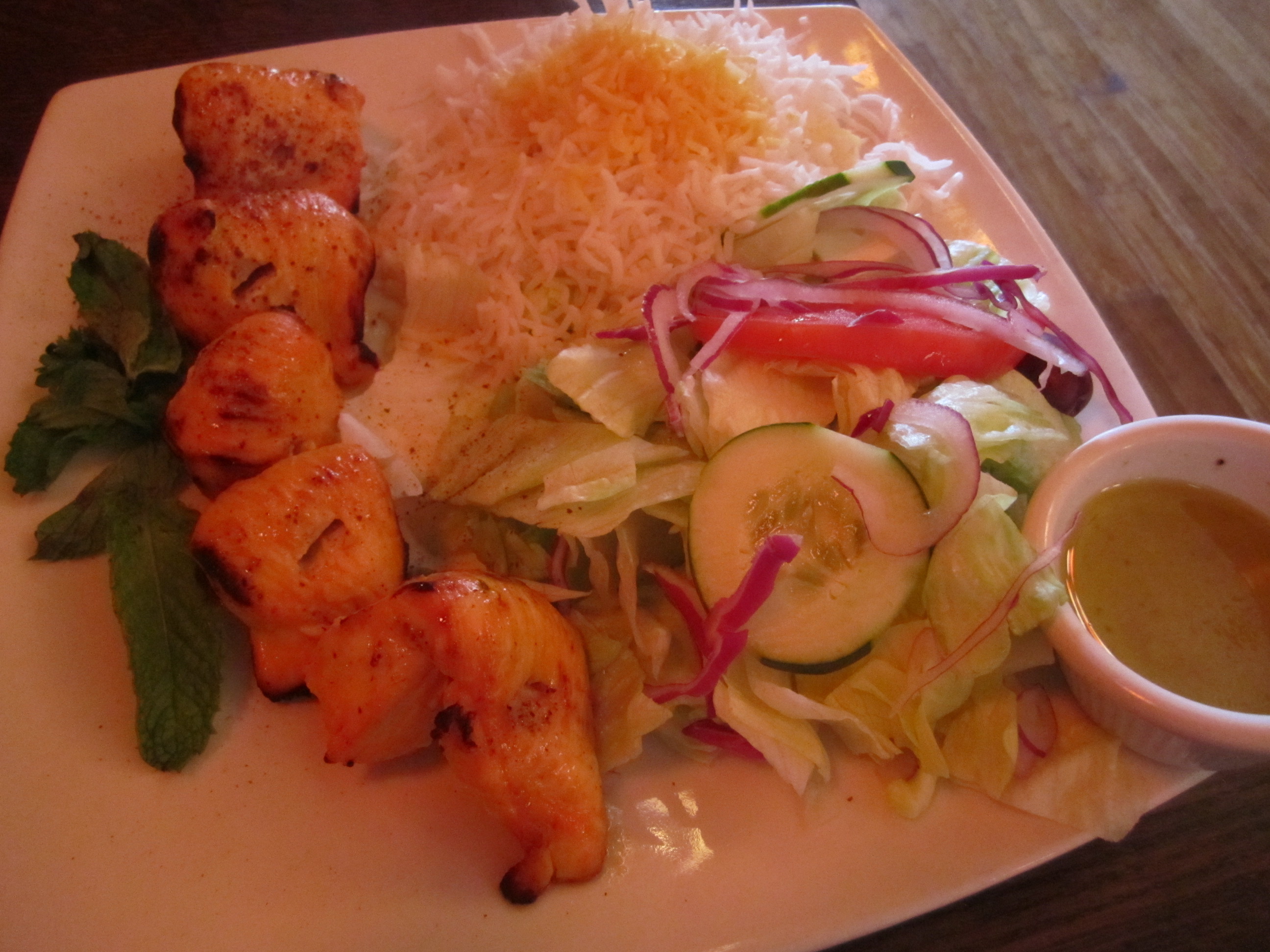 My mom ordered the chicken kabob platter, which had all the fixings of the falafel platter just with bite-sized grilled chicken pieces. As you can see, everything on the lunch platters is fresh and healthy.