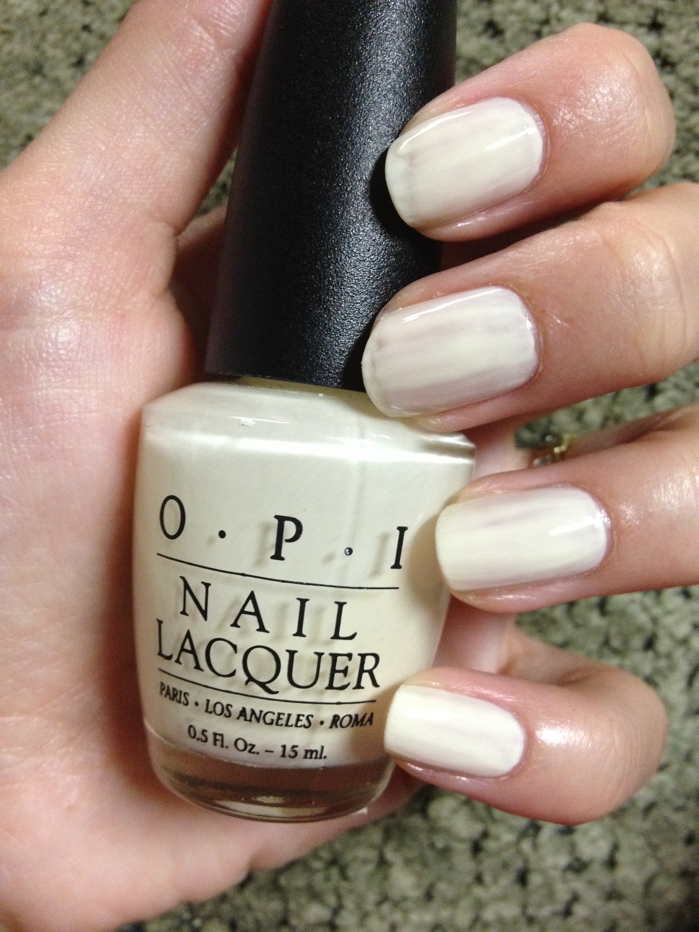 I started, as usual with a base coat of Seche Natural.  I really wanted the glitter to be the star of the show here, so I kept my base color neutral with three coats of OPI‘s Swedish Nude, a barely off-white color.  I typically wouldn’t use three coats of a base color, but I’ve been doing that more often lately, and Swedish Nude isn’t very opaque.  As long as they’re three thin coats, I think it’s okay.