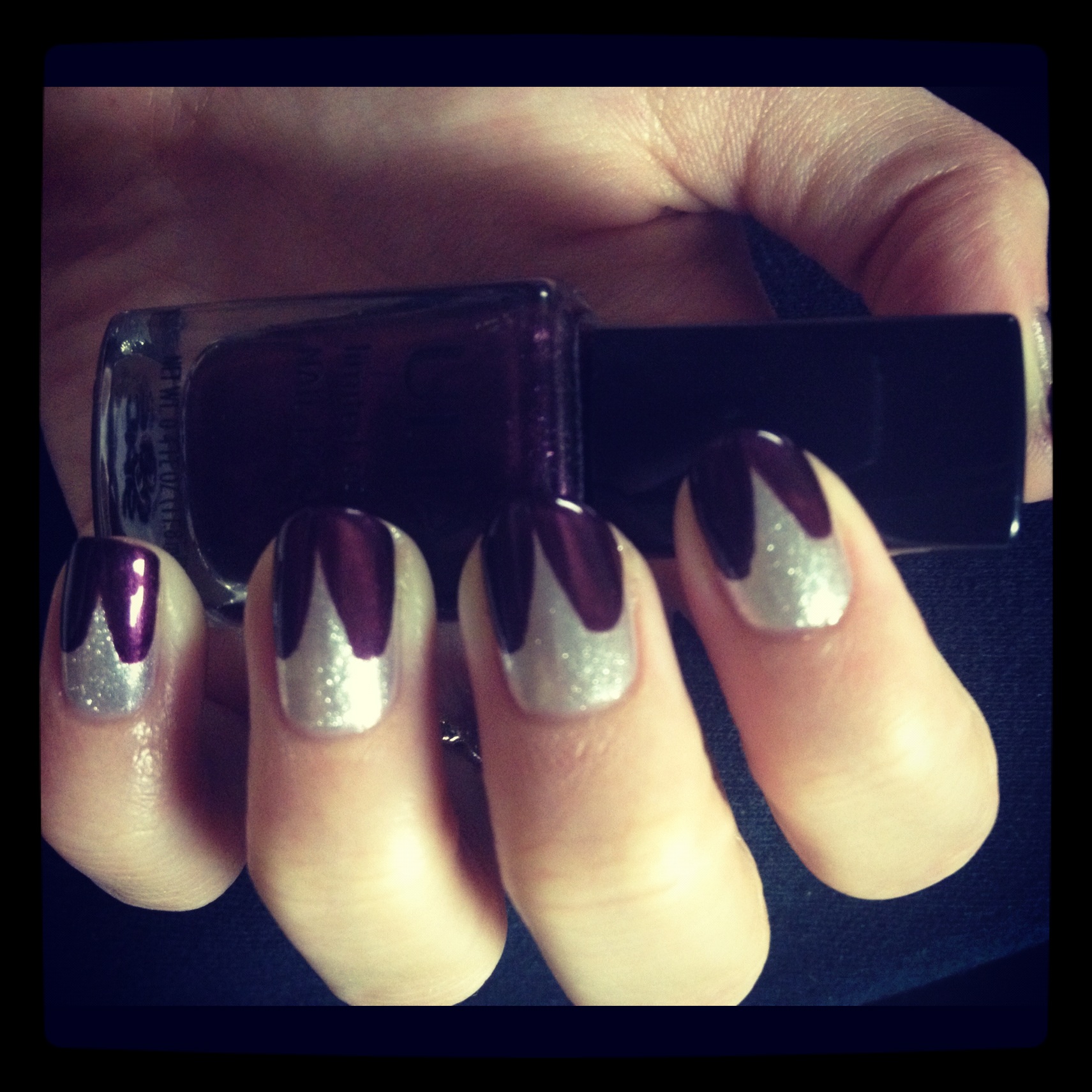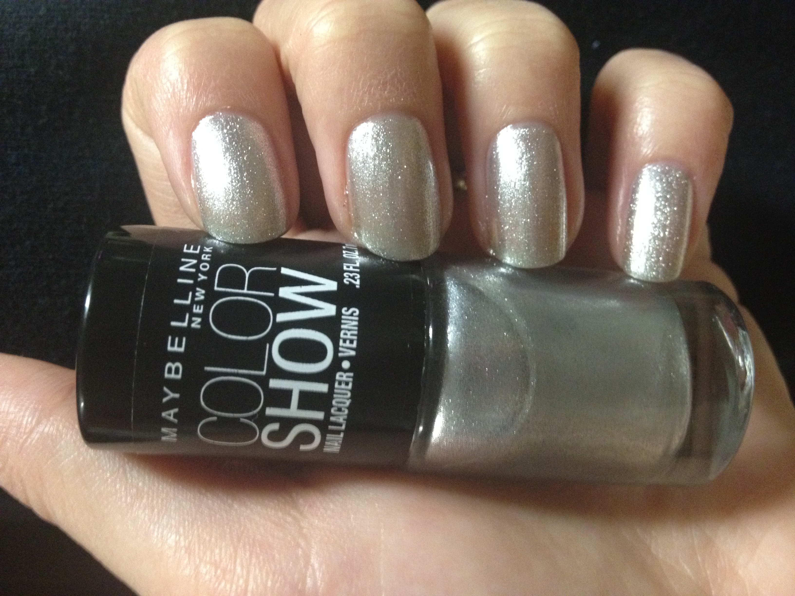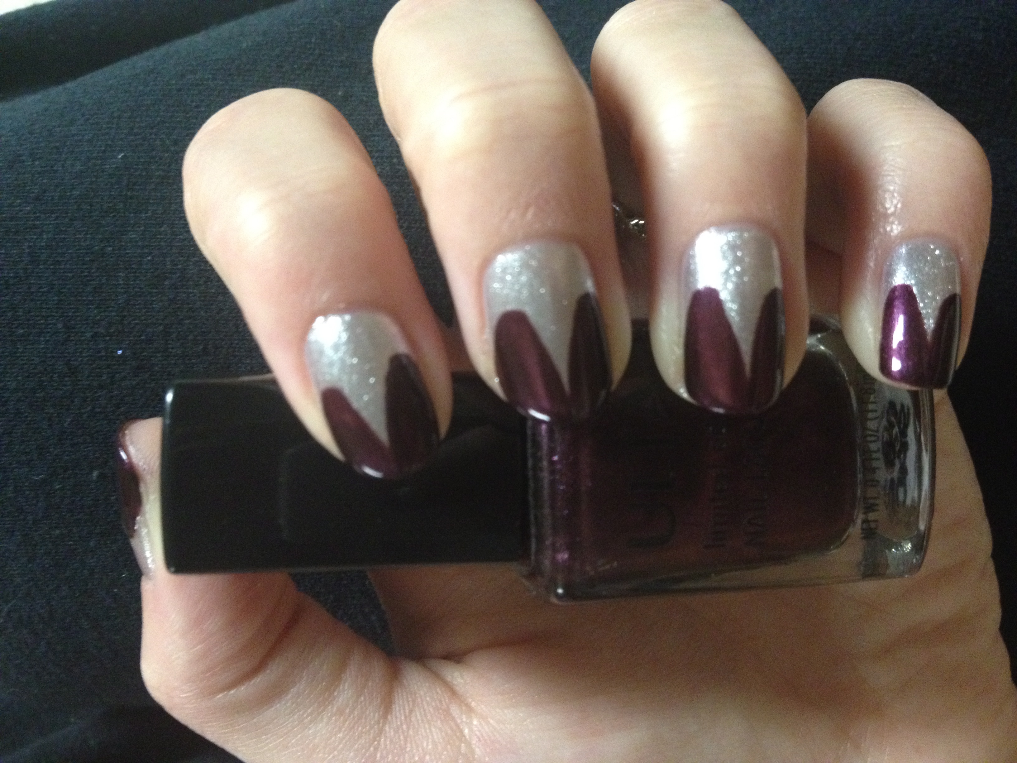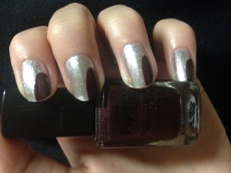 Back to the manicure. Start out with the color that you want to be your “claw.” I think that this should be the brighter, bolder color. Whether you want to use glitter or not, the key to this look is using a color that will stand out against your other color. I used Maybelline’s Color Show Nail Lacquer in Pedal to the Metal, which is a trying-to-be-opaque silver glitter. I love it, really, but it’s not as opaque as I’d like, so I have to use three coats to get the look I want.