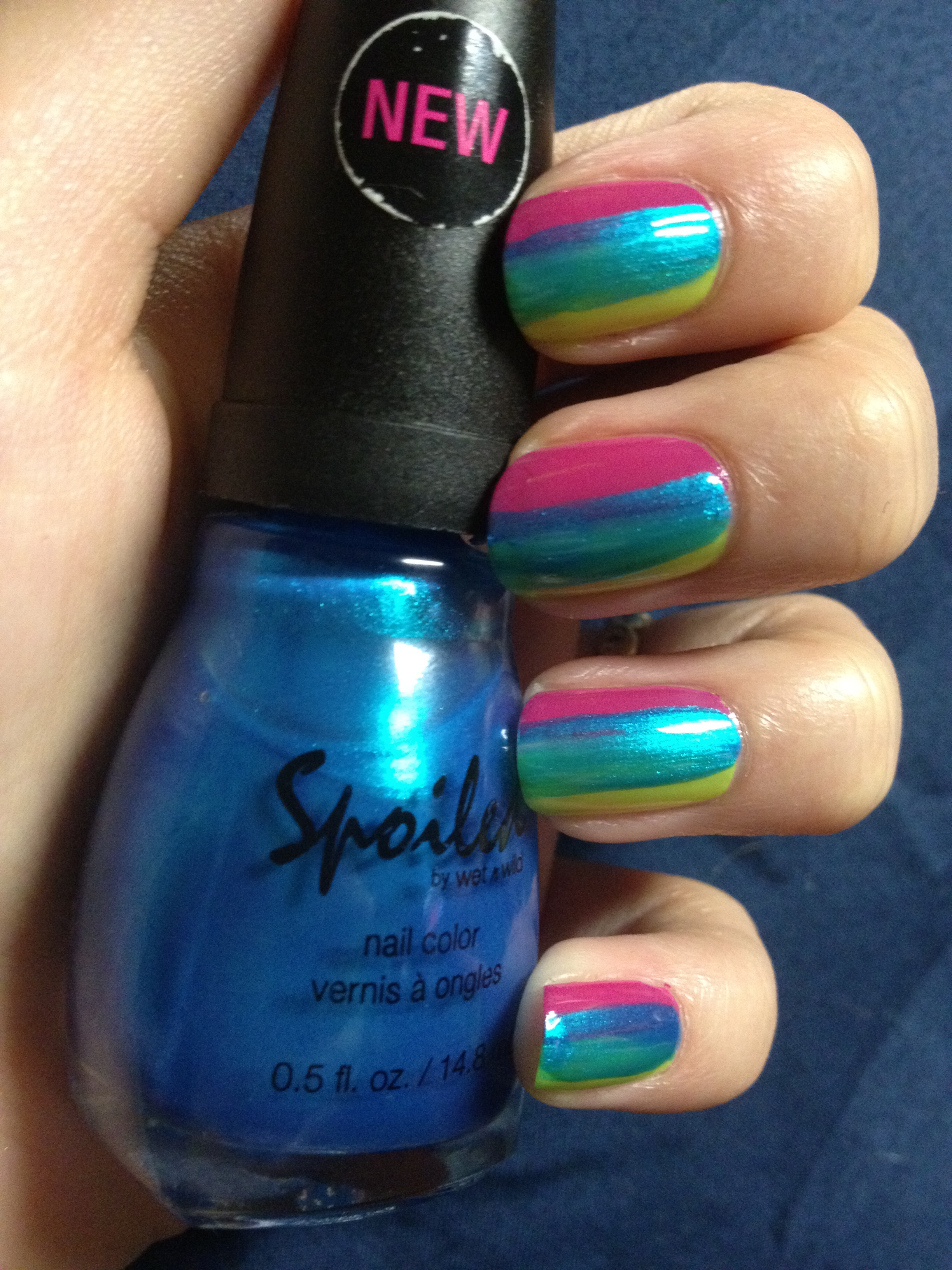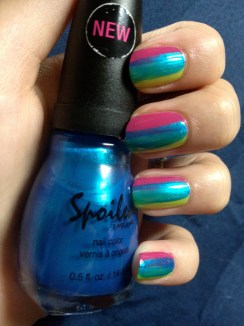 My final color was Spoiled Nail Color by Wet n Wild’s Plenty of Fish in the Sea. I applied this last because the blue was able to blend easily with the pink to create purple and with the yellow to create green. It helped to create more of an ombre look and fade any harsh lines. Plenty of Fish in the Sea is one of my favorite nail polishes. I bought it for my Spring Break trip to the Bahamas and I got so many compliments on it – probably more than any other color! It’s a gorgeous color that really matched the color of the ocean in the Bahamas. Perfect for that trip, but also perfect for this manicure!