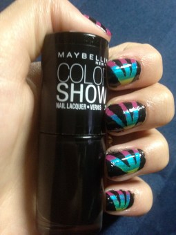 Complete the look with a thin coat of black polish on each nail. I used Maybelline’s Color Show Nail Lacquer in Onyx Rush. One thin coat should be enough to cover all the colors, but if not, it’s okay to use two thin coats. Let the polish dry a little bit before you remove the tape. Remove the tape, add a top coat, e finito!