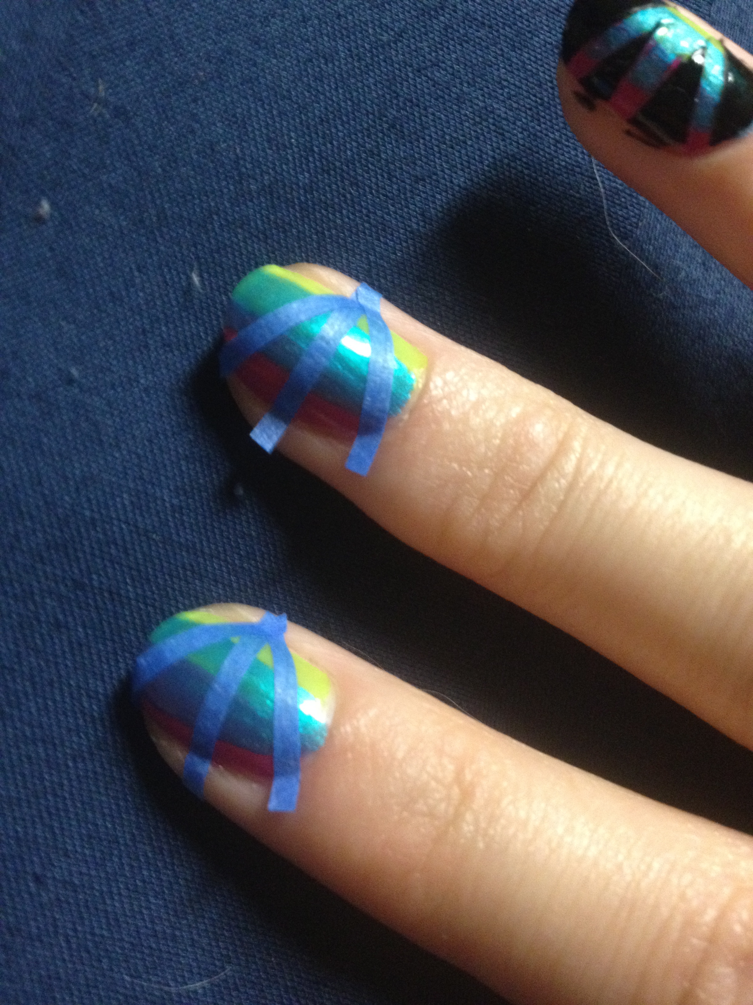 So right now it looks kind of childish – how do you get the cool design? Before proceeding to the next step in this manicure, you want to make sure you let your nails dry. It’s really important because we’ll be working with tape. If your nails aren’t dry, you’ll probably mess them up trying to cut the tape, but if they’re not 100% dry, you’ll definitely mess them up once you put the tape on them. If the polish is even a little tiny bit wet, the your polish will come off when you remove the tape. So be patient!