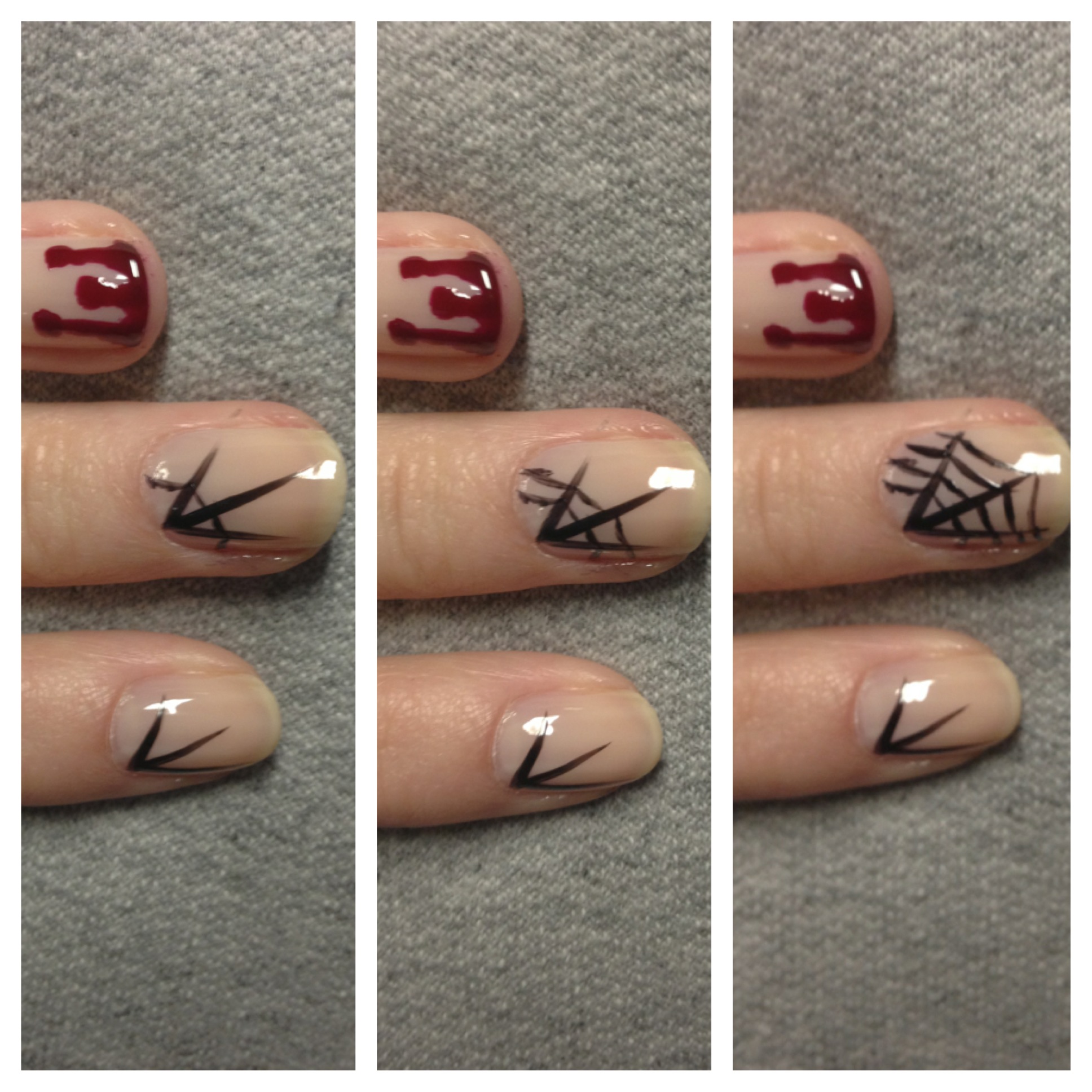I turned the rest of my nails into spider webs using the Kiss Nail Art Paint kit. Taking the black nail art paint, I created three lines extending from the base of my nail. These lines will create the base of the spider web. To continue to design, I connected each of these three lines as shown in the image to the right. Continue connecting the lines towards the tip of your nail. The more lines you create, the more it looks like a spider web! And don’t worry if your lines aren’t too neat – spiders don’t seem to care, so why should we?