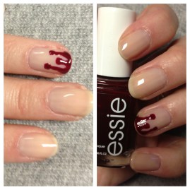 I started the design with my accent nail. I really couldn’t wait to try out the design I had in mind – blood drops. This look doesn’t always have to be so … bloody. In fact, you could use it any other time of year if you swap dark red out for bright colors. It’ll look like paint drops! Creating the drops is easier than you’d think. Create three small dots in varying places on your nail using a dark red color. I used Essie’s Bordeaux. Drag the dot of polish down to the tip of your nail. Finish the look by sweeping the polish across the tip of your nail, like a French manicure.