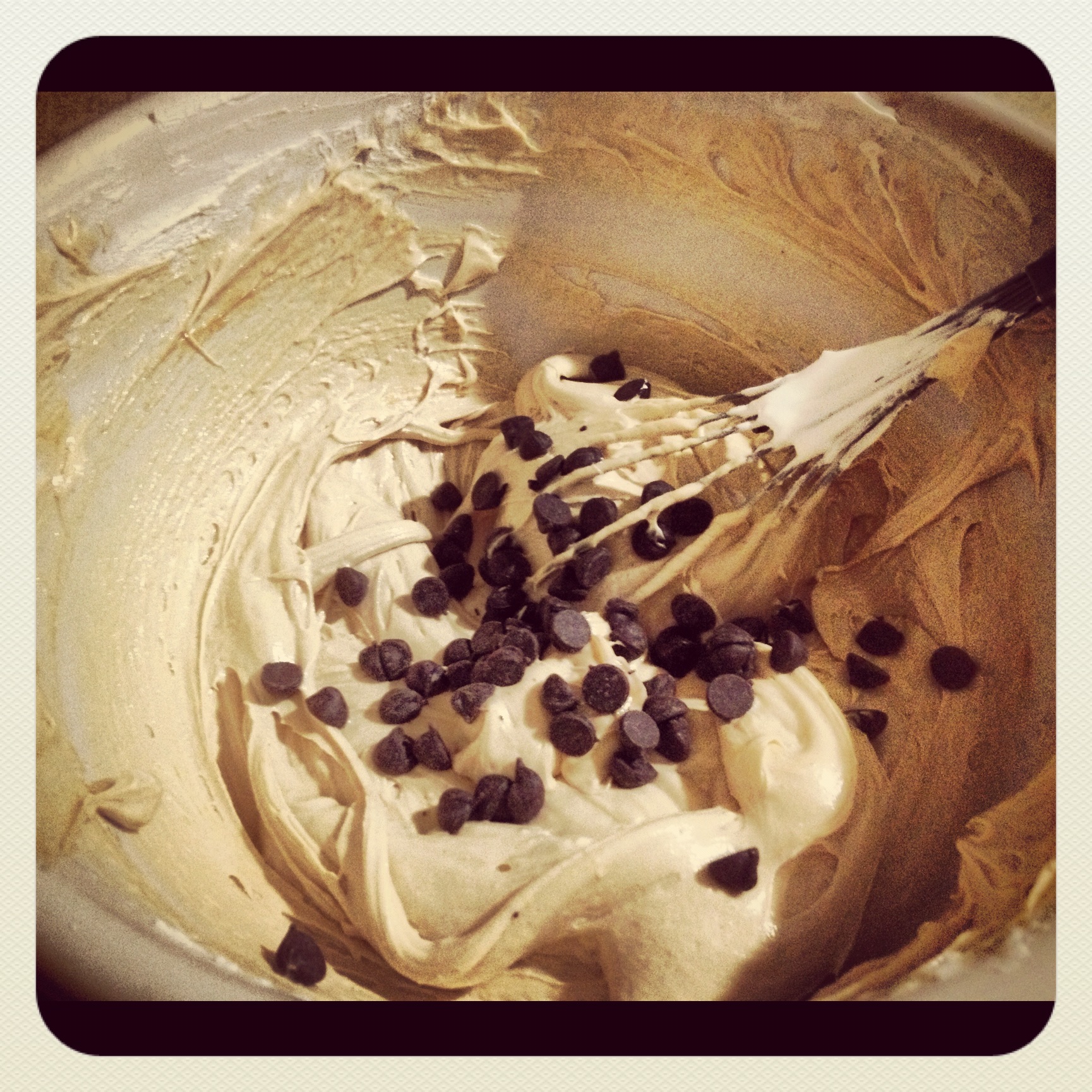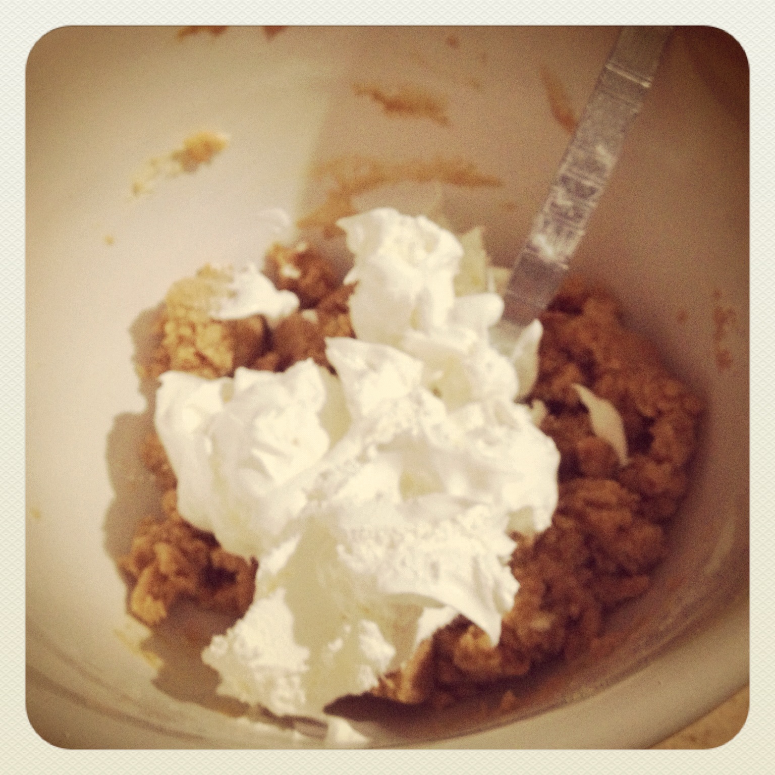 Once you’ve added all the sugar and your consistency is something like dry chunky peanut butter, it’s time for the whipped topping! Slowly add your whipped topping to the bowl in ¼ chunks, so you’ll be able to incorporate everything carefully.