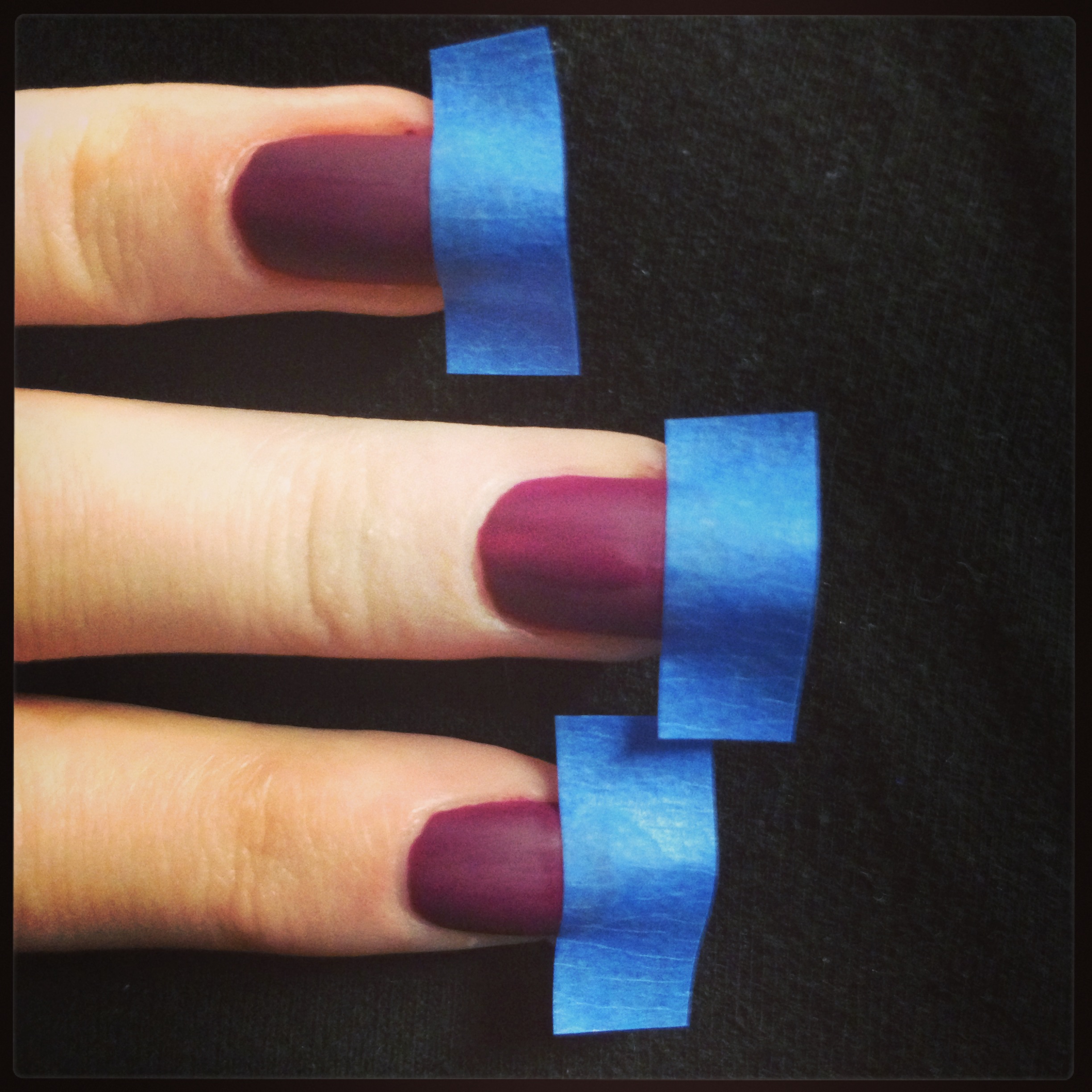 photo 3Cut out ten small strips of tape – about the width you’d want your French tip to be. I used blue painter’s tape. I think painter’s tape works the best and doesn’t leave any residue behind. Apply each of the strips of tape to the tips of your nails, just like French tips. The tape acts as a barrier from the matte topcoat to keep the tip of your manicure glossy.