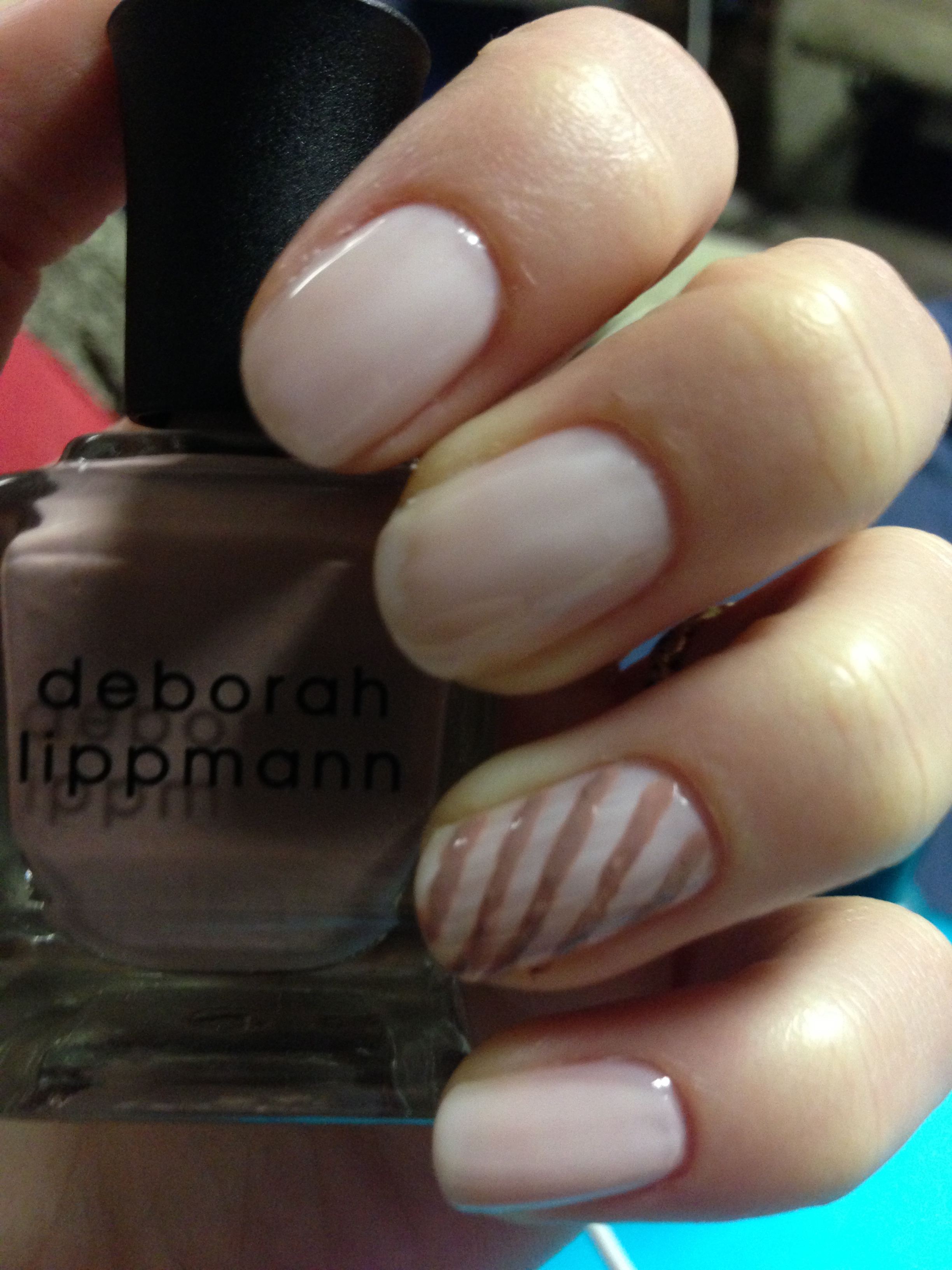 To create the stripes, find a polish in a similar color family, but darker shade. I used Deborah Lippmann’s Modern Love. Take a skinny paint brush – you can find really tiny watercolor brushes for cheap at a dollar store – and dip it in your polish. Carefully draw skinny lines on a diagonal across your nail, leaving equal amounts of space between each line. Don’t fret if your lines aren’t totally straight or perfect. Mine definitely weren’t. Drawing a straight line is harder than you think.