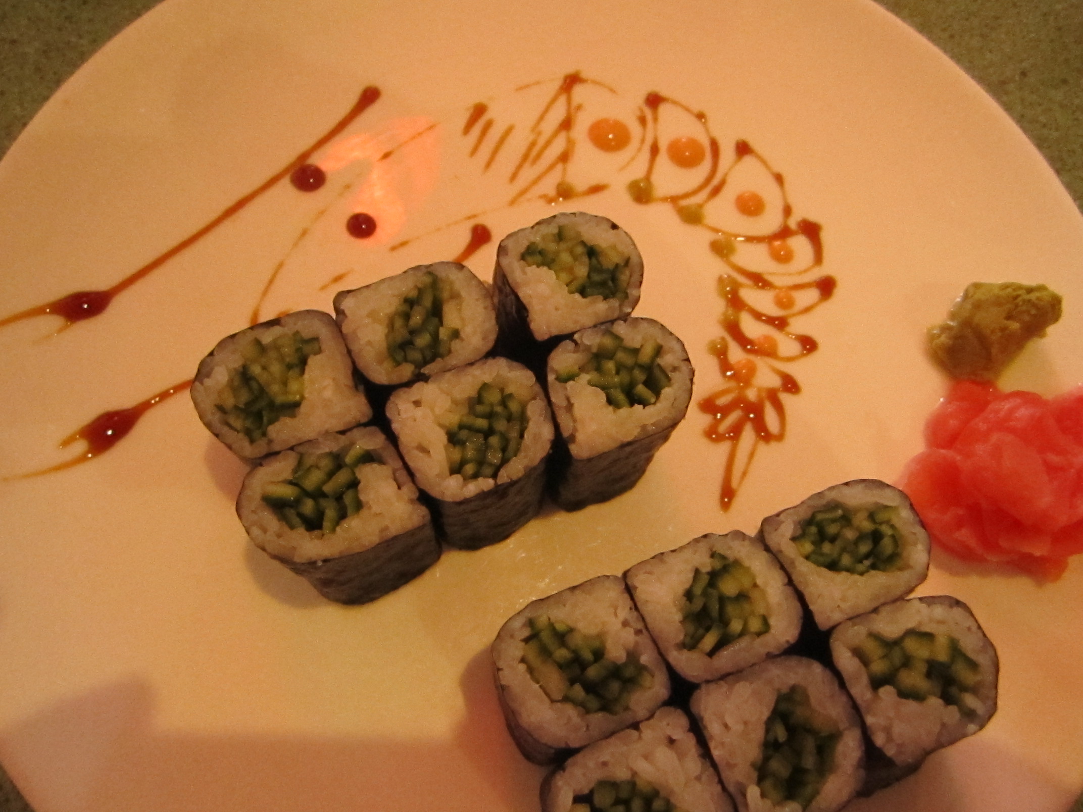 IMG_0015Two cucumber rolls, with sauces artfully done as a shrimp.