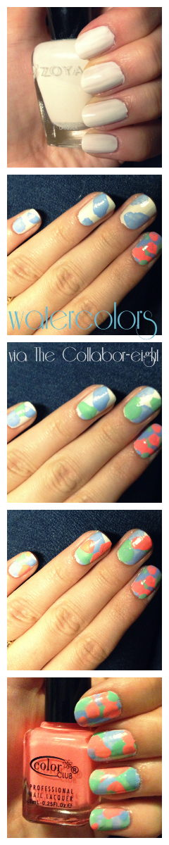 To create the water color design, you’ll need a few different colors of your choice – I would recommend using pastels if you’d like to stick to the watercolor theme. Otherwise, feel free to use whatever you’d like! I used Essie’s Bikini So Teeny, Maybelline Color Show Nail Lacquer in Green with Envy, and Color Club’s Reign in Spain – and a straw. Yep, just a plastic disposable drinking straw. I cut mine in half because I think it’s easier to manipulate that way.