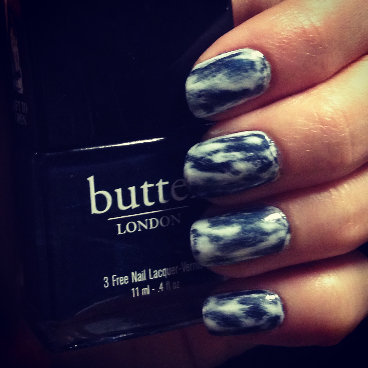 Manicure Monday: Acid Wash via The Collabor-EightAfter completing your basic manicure – buffed, filed, and coated with Nail Tek II – apply two coats of a dark navy blue.  I used Butter London’s Big Smoke, a beautiful metallic navy blue. Wait until your base color is completely dry before moving on.  The drier it is, the easier the rest of your manicure will be!