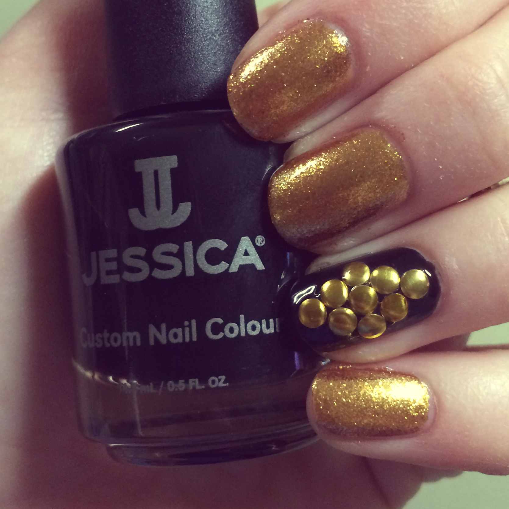 The accent nail was really the guiding force for this manicure – I’m totally on the nail stud train.  To create the accent nail, I applied two coats of Jessica Custom Nail Colour in Black Matte.  After letting these nails dry completely (it’s much easier to handle nail studs when your nails are dry), I applied gold nail studs in a diamond shape.  To learn how to apply nail studs, click here. I sealed the studs in and finished the look with NYC’s Matte Me Crazy Mattifying Top Coat.