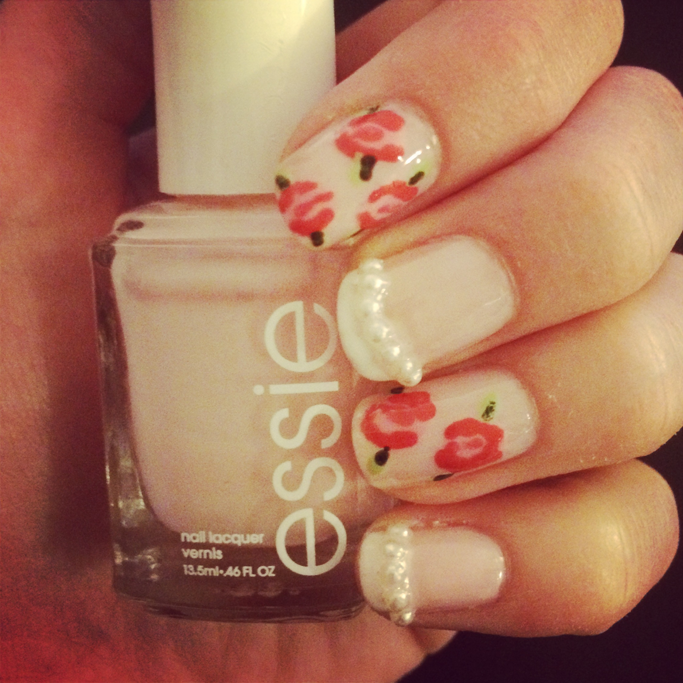Manicure Monday: Favorite Things via The Collabor-eightI’m always looking for manicure inspiration everywhere I go. Sometimes I get inspired by a piece of clothing I own, sometimes I get inspired by a holiday or what’s on TV – and sometimes I just get inspired by the nail polish and nail art tools I have sitting in my room. This manicure was inspired by the latter. I had nail art pearls leftover from a previous Nail Art Society kit and I really wanted to use them. What I came up with was flowers, a French manicure, and some pearl details – a few of my favorite things!