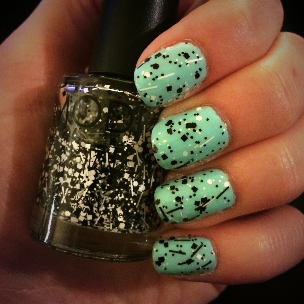 My little sister recently took a trip to South Korea, so naturally, when she asked what souvenir I wanted, I said nail polish. She came back with the eight beauties, plus some fun nail art studs. Obviously, I couldn’t wait to get started! A black and white glitter polish really caught my eye – it’s a translucent polish filled with different sizes and shapes of black and white glitter flecks. Click through to see how I got this look (and why I’m calling it Mint Chocolate Chip)!